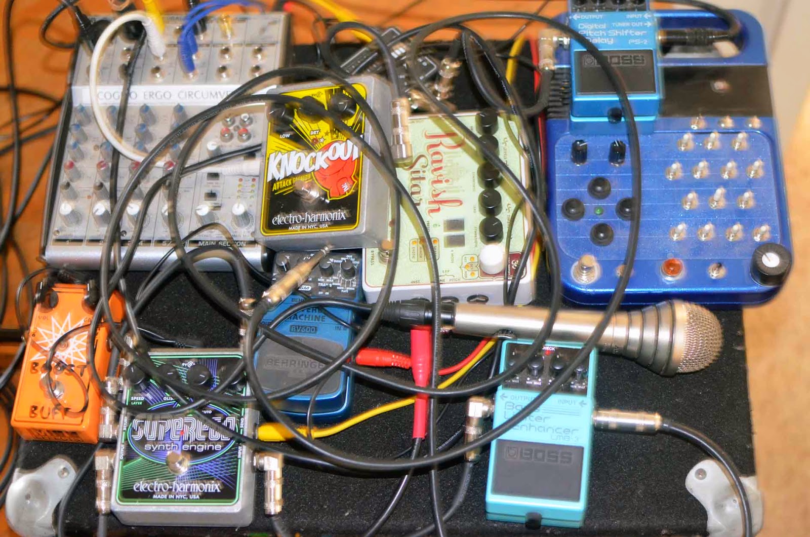 Above is video of an alternate take. It's not the clearest picture but you can see a bit. The theremin is run through a Ravish sitar-emulator pedal, which keeps it in key and sounds nice. The bass is sorta sampled with a circuit bent Boss pedal. In the earlier take below I sampled my voice with the same effect, something I did for tracks in my set last night.