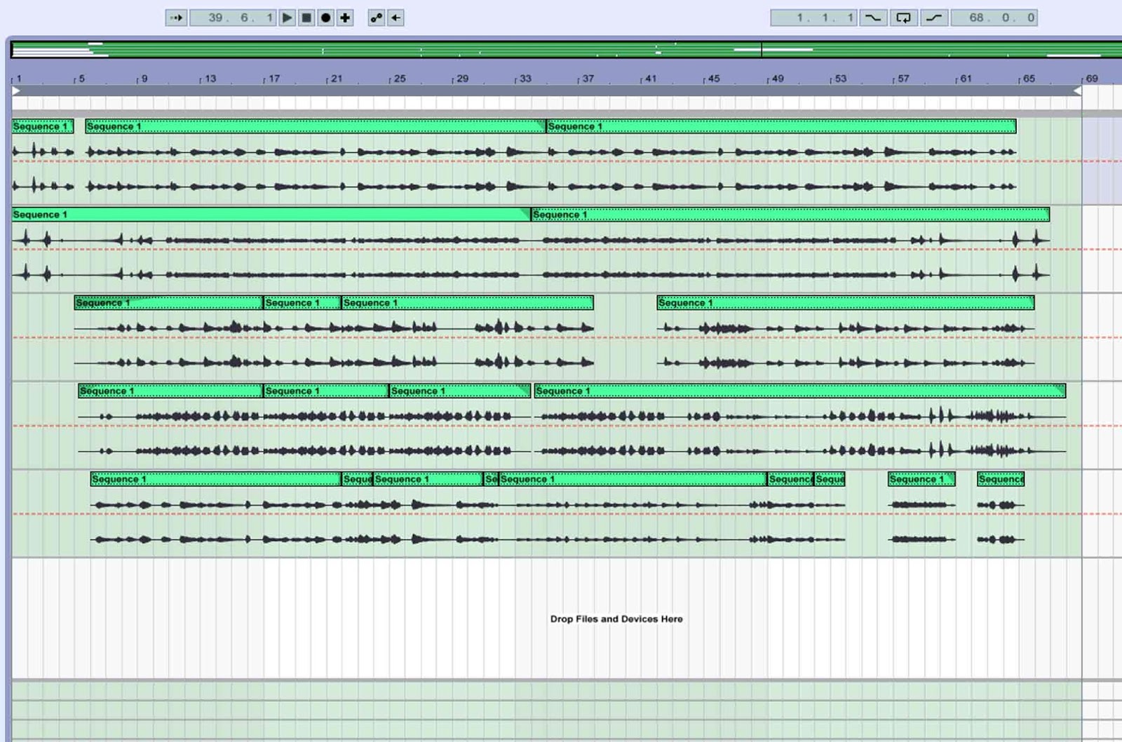 Initially I selected six loops as I'd initially planned and these were stereo panned. For variation I added sections where I was playing the loop as well as looped recordings but in the end there were five parts that were largely long takes.